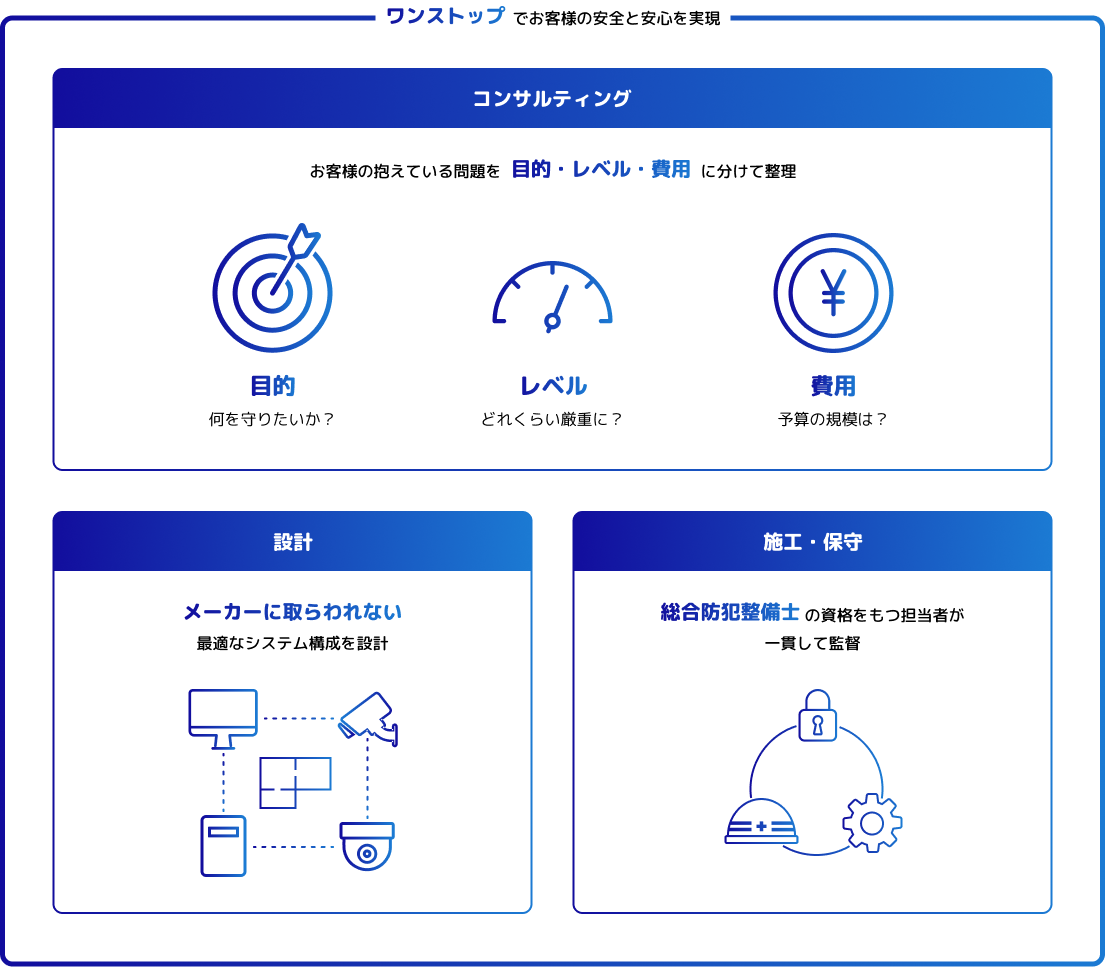 当社は、お客様のセキュリティニーズを具体的に分析し、「守ることの本質」を踏まえたソリューションをご提案します。目的に応じた手法や、セキュリティレベル、必要なコストについて、お客様の立場でコンサルティングを行い、機器の調達から施工、保守まで、ワンストップで実現します。